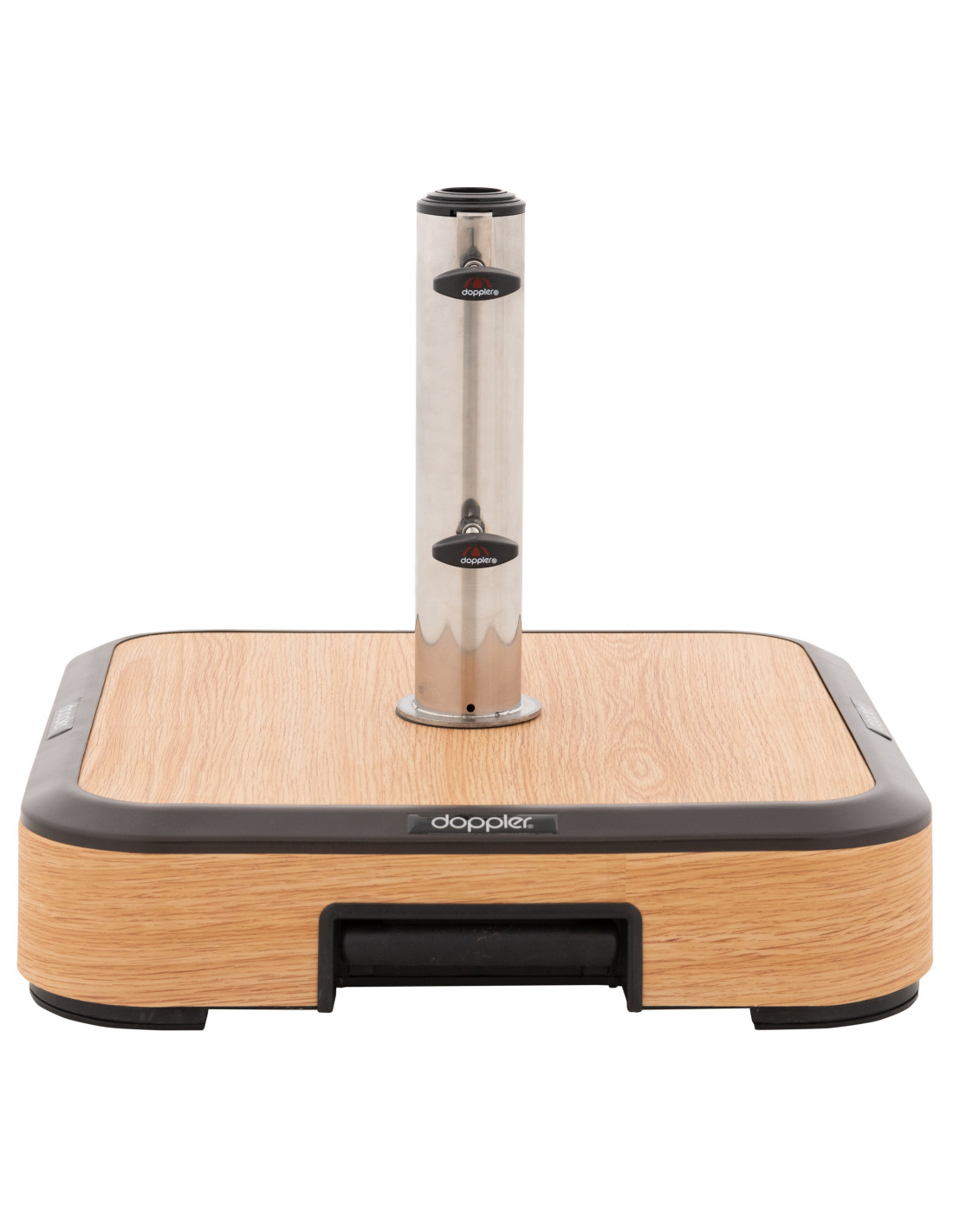 Chcete přesunout svůj slunečník na jiné místo? Žádný problém! S moderním pojízdným stojanem Alu Wood Troley to půjde rychle a snadno: s pomocí 2 koleček a zasouvací rukojeti se s podstavcem snadno a bez námahy manipuluje a posouvá po prostoru. Výsuvná rukojeť a kolečka s hladkým chodem umožňují snadný pohyb slunečníků. Podstavec má velice elegantní provedení a stylové hliníkové pouzdro s motivem dřeva.