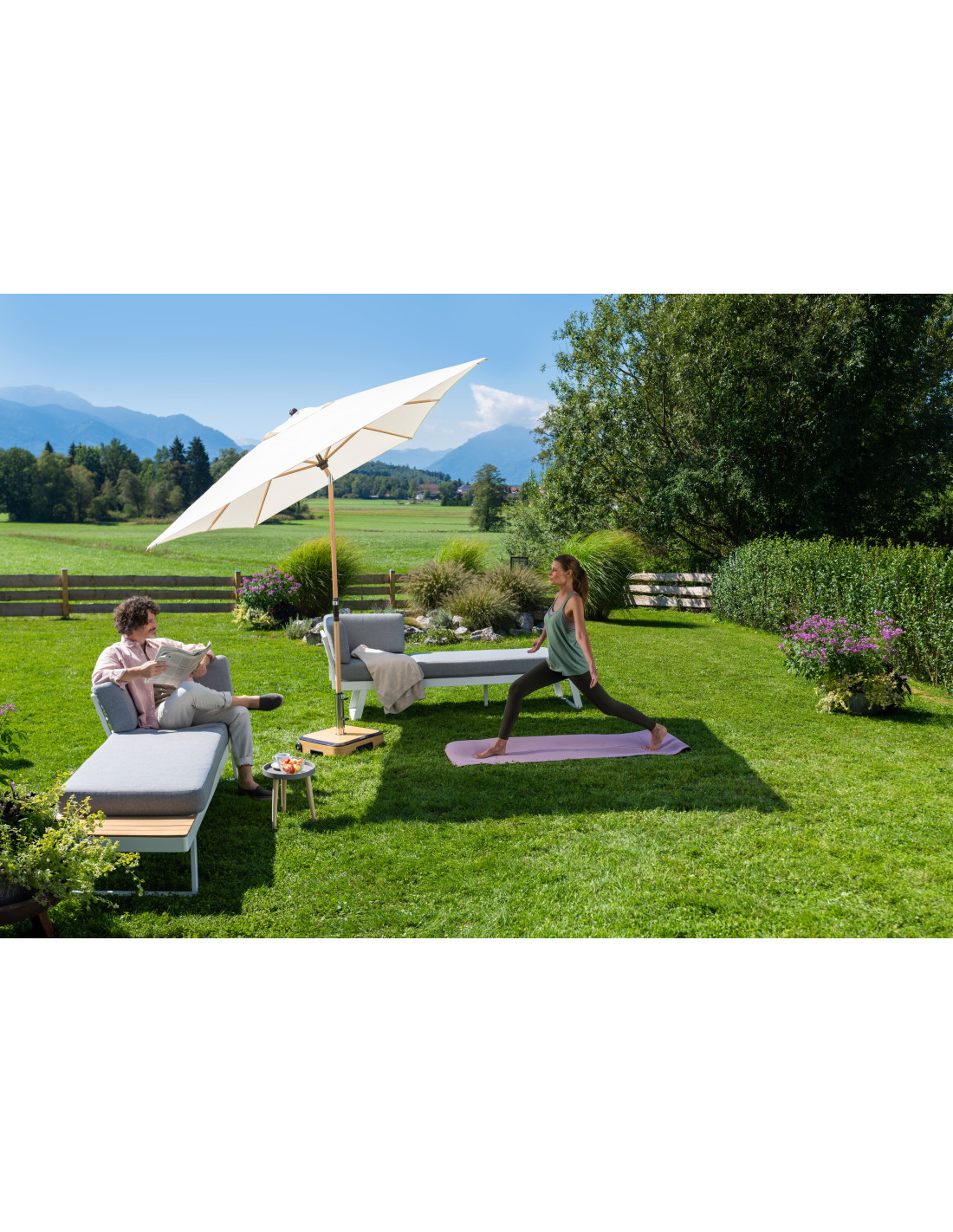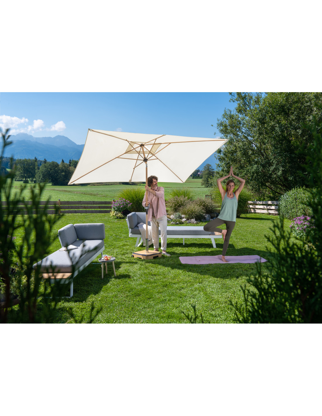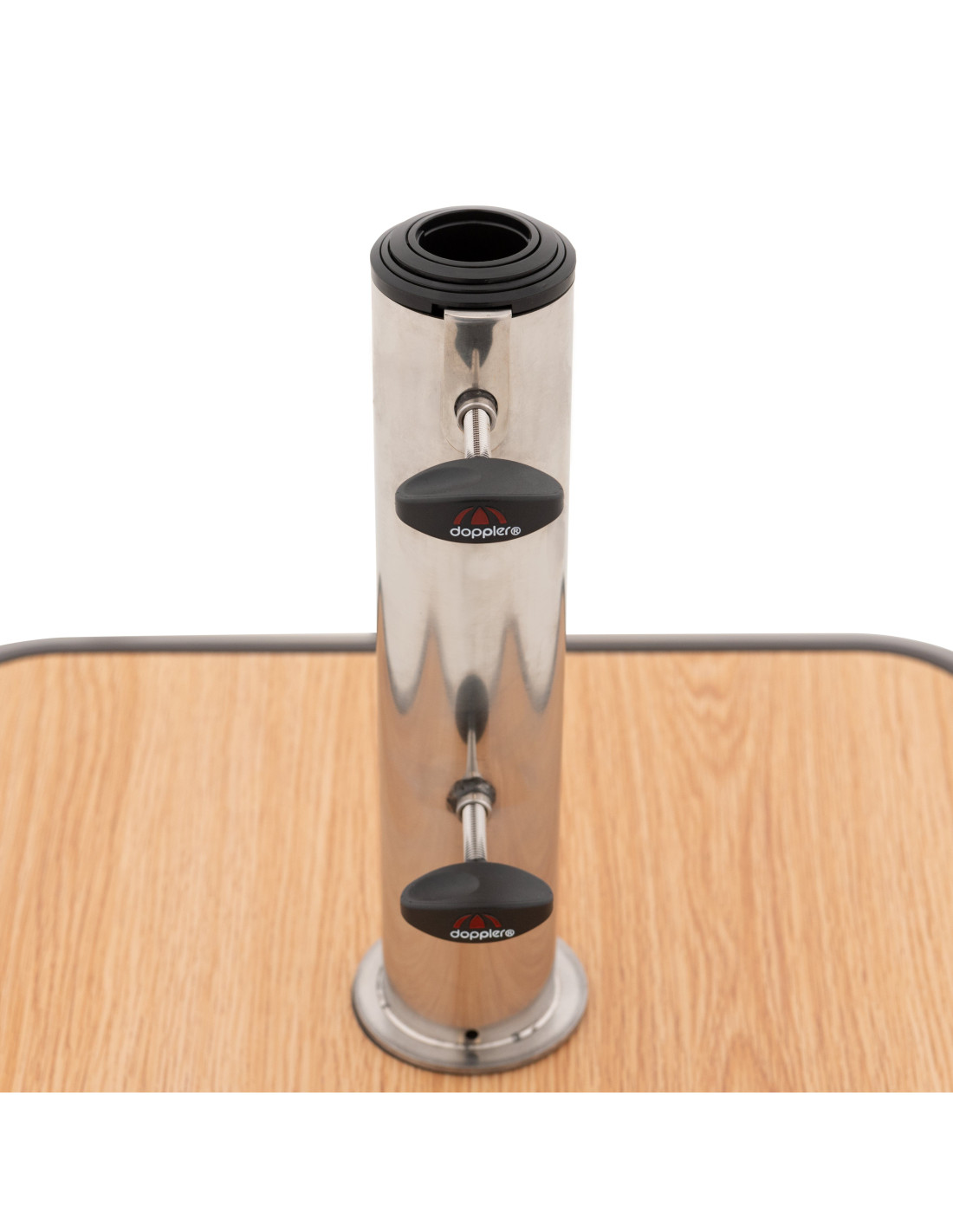 Zaoblené hrany podstavce zabraňují nebezpečí poranění. Rukojeť je možné snadno a prostorově úsporně uložit do základny. Slunečník lze do stojanu bezpečně ukotvit pomocí robustní nerezové trubky a dvou zajišťovacích šroubů.