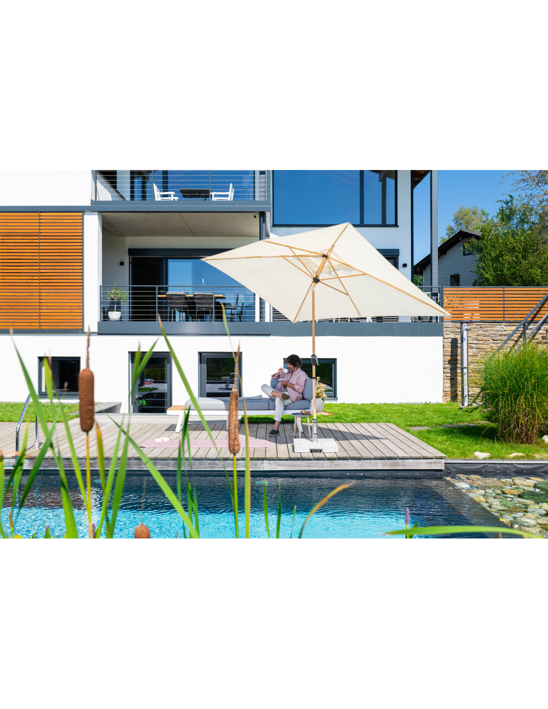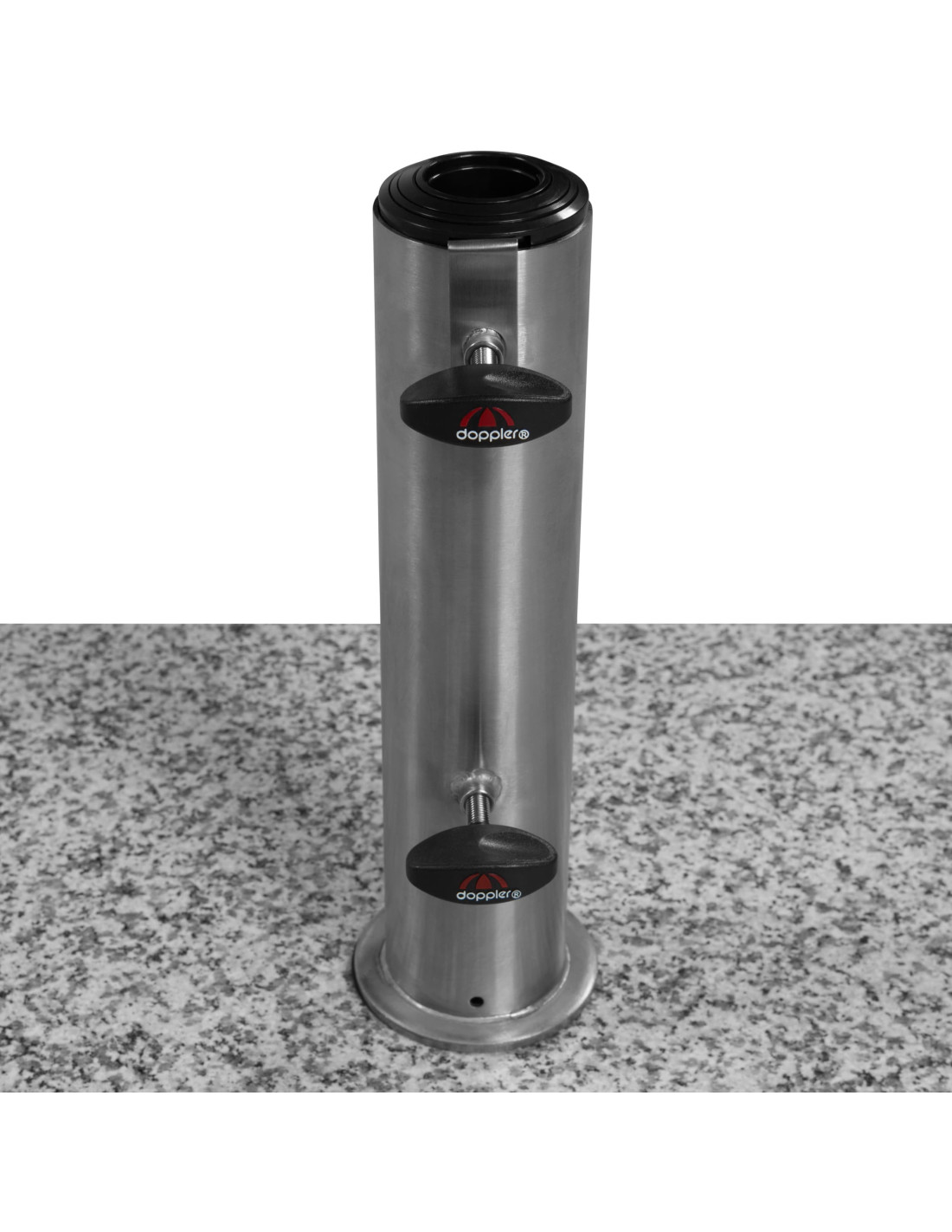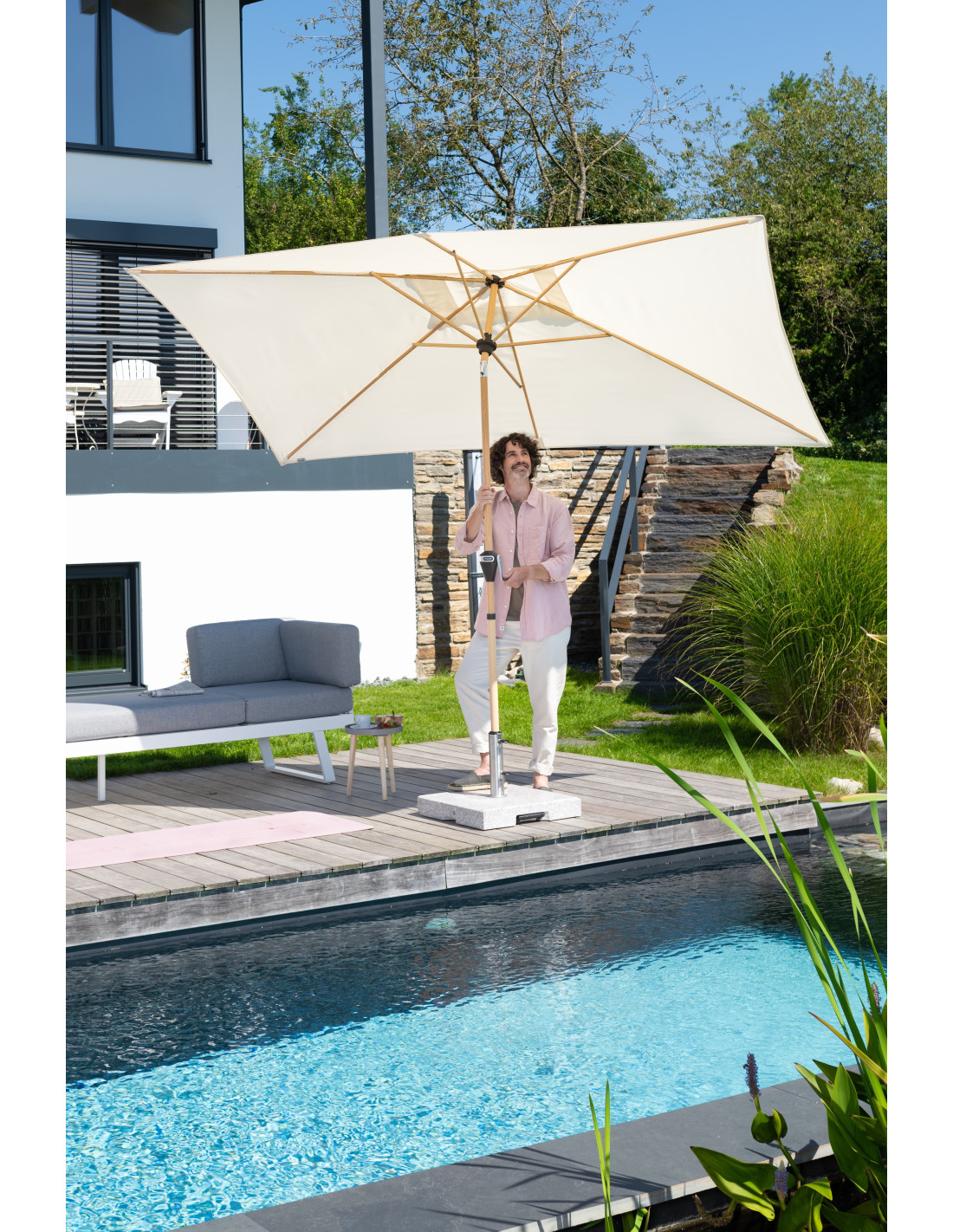 Tento stojan ze světle šedé leštěné žuly je vybavený 2 koly a rozšiřitelnou trolejovou rukojetí pro snadnější přesouvání. Slunečník se kotví do trubky z nerezové oceli a zajišťuje pomocí dvou pojistných šroubů. Trubka má několik redukčních kroužků, které umožňují použití průměrů tyče slunečníku 32–60 mm. Díky hmotnosti 70 kg je zajištěna bezpečná stabilita i středně velkých středových slunečníků až do průměru střechy 350 cm.