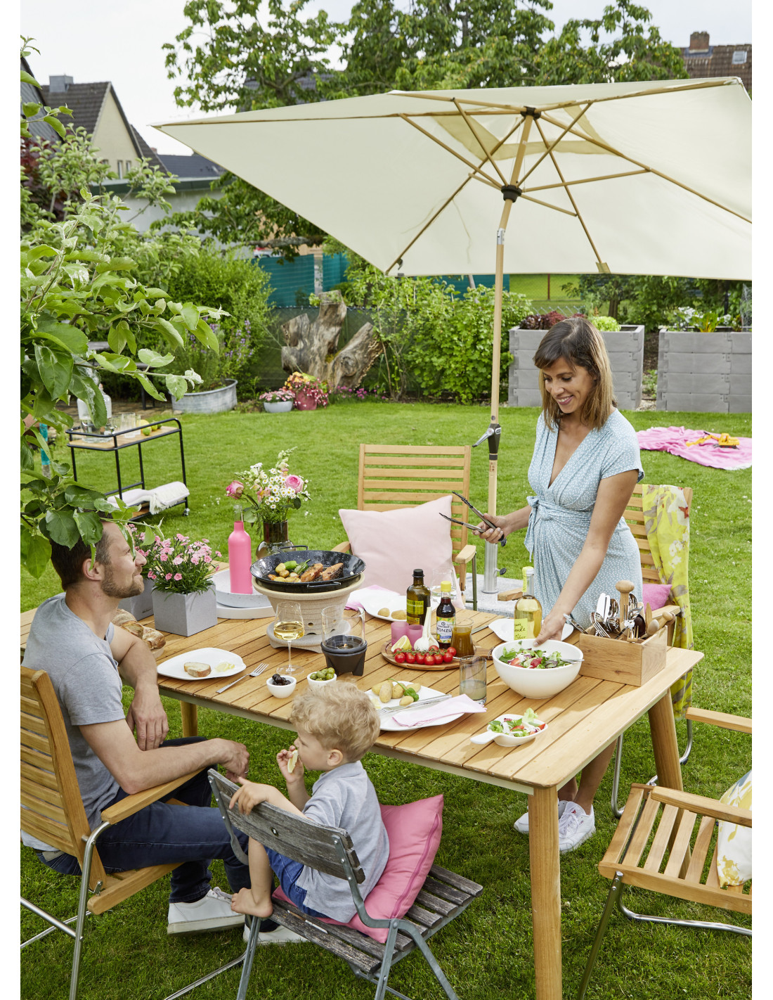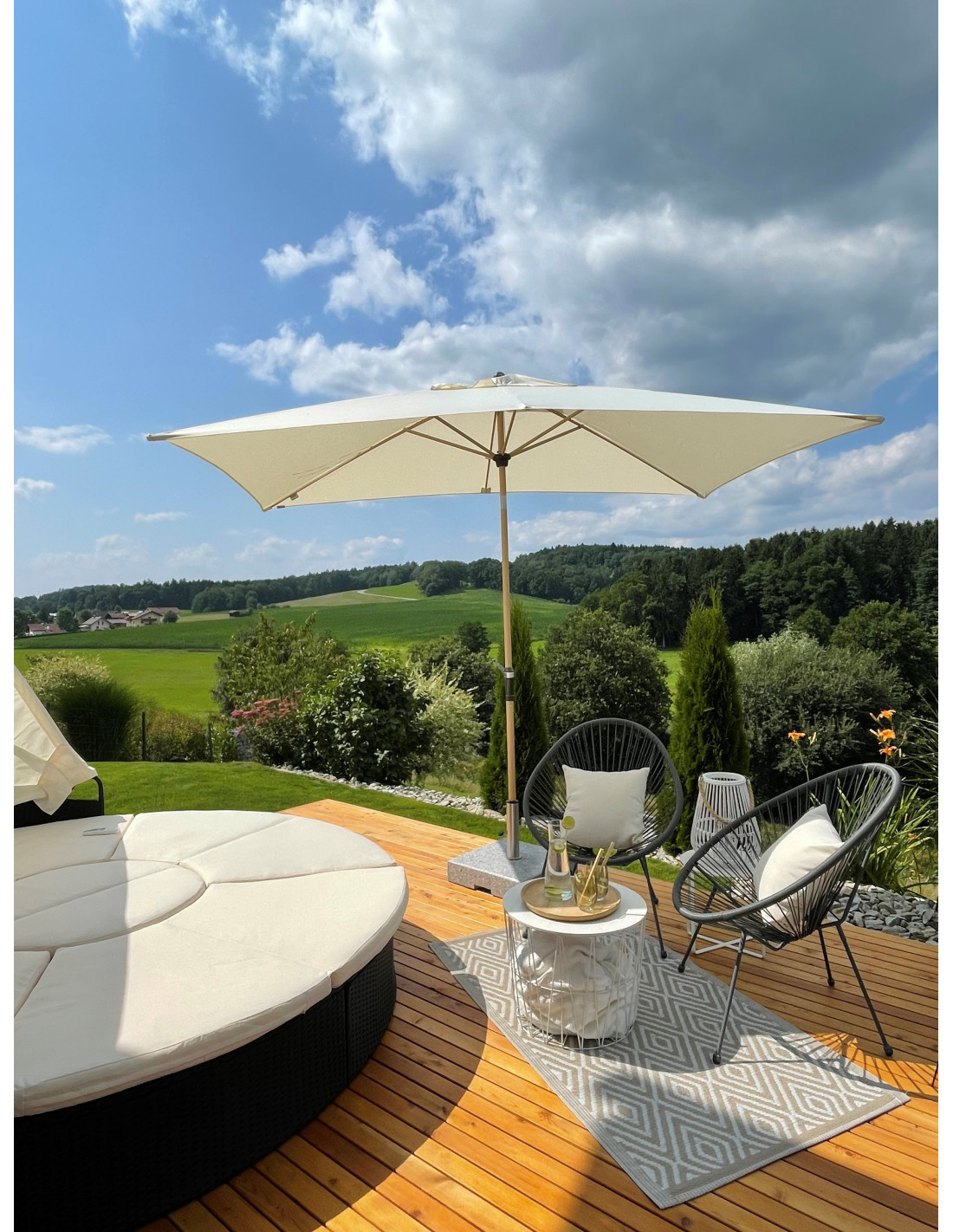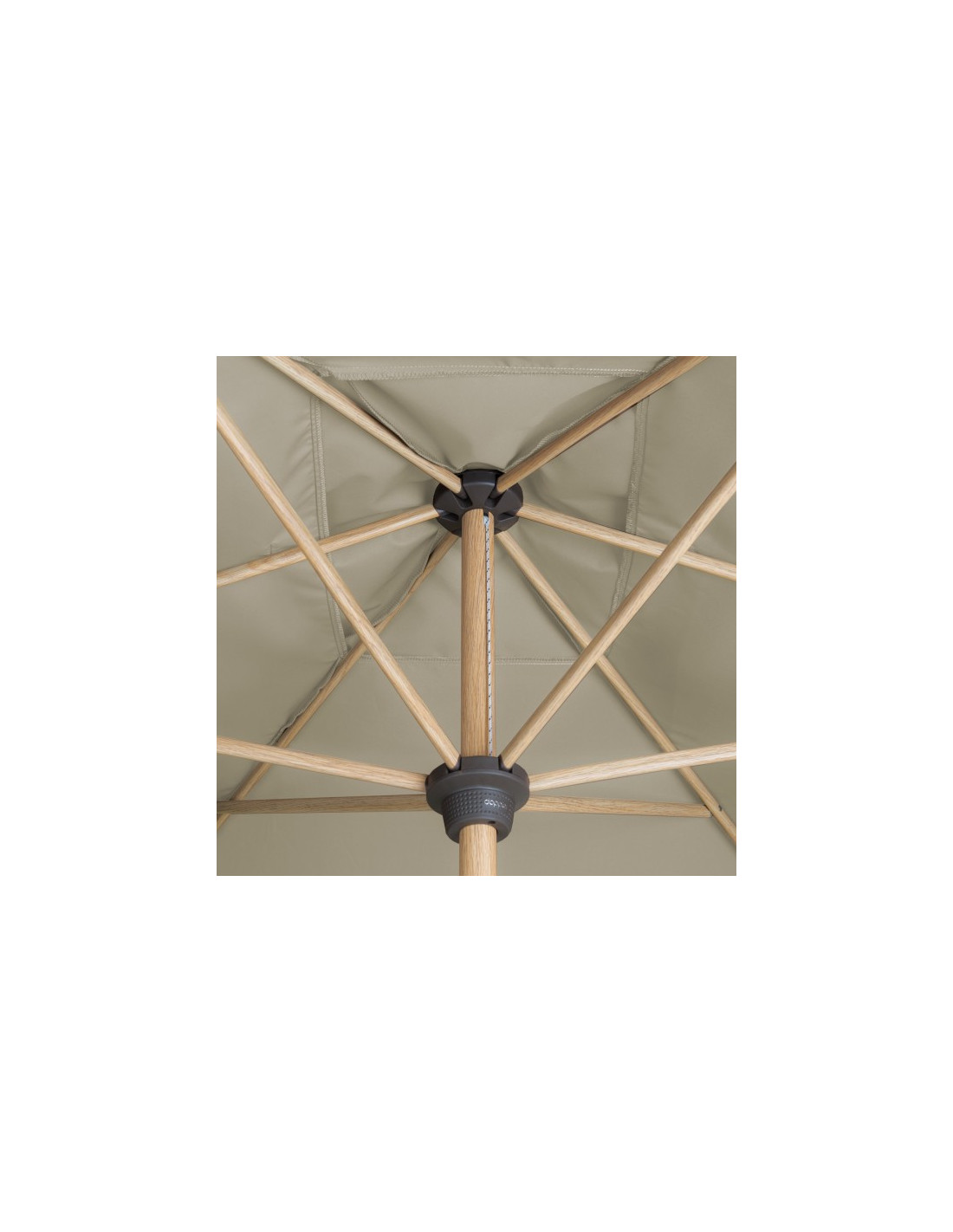 Tento slunečník udělá radost milovníkům dřeva. Díky nadčasovému vzhledu v imitaci jasanového dřeva a potahům v teplých přírodních barvách, se hodí téměř na každý balkón, terasu nebo zahradu. Slunečník nabízí uživatelsky přívětivý provoz, obsluha pomocí kličky. Má možnost naklápění do 3 pozic. Rám slunečníku je vyroben z vysoce kvalitního hliníku a vzpěry z oceli, což umožňuje dlouhou životnost. Potah má vynikající ochranu proti UV záření 80+. Díky ventilačnímu otvoru ve střeše se pod slunečníkem nekumuluje horký letní vzduch.