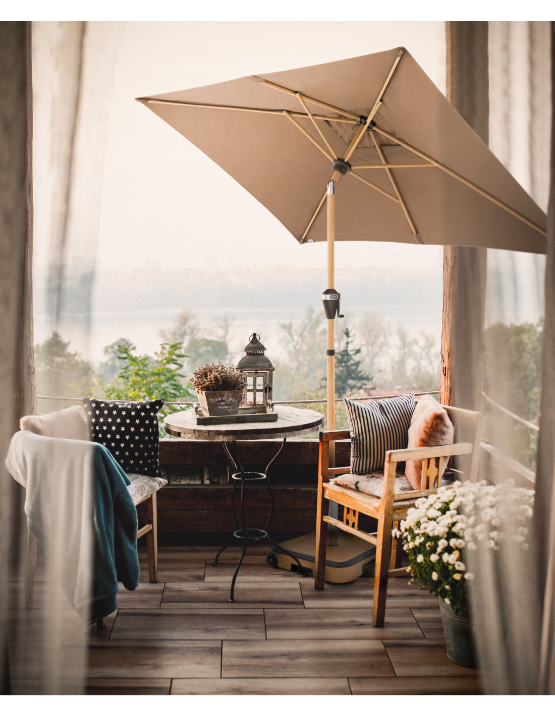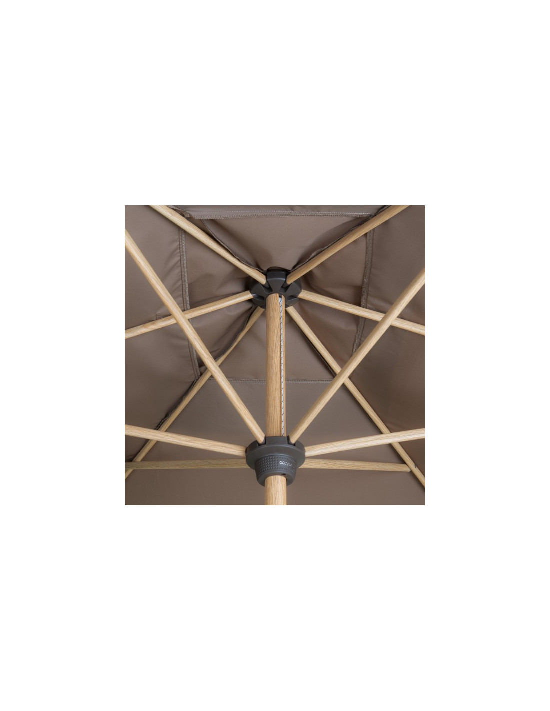 Tento slunečník udělá radost milovníkům dřeva. Díky nadčasovému vzhledu v imitaci jasanového dřeva a potahům v teplých přírodních barvách, se hodí téměř na každý balkón, terasu nebo zahradu. Slunečník nabízí uživatelsky přívětivý provoz, obsluha pomocí kličky. Slunečník má možnost výškového nastavení o 15 cm. Rám slunečníku je vyroben z vysoce kvalitního hliníku a vzpěry z oceli, což umožňuje dlouhou životnost. Potah má vynikající ochranu proti UV záření 80+. Díky ventilačnímu otvoru ve střeše se pod slunečníkem nekumuluje horký letní vzduch.