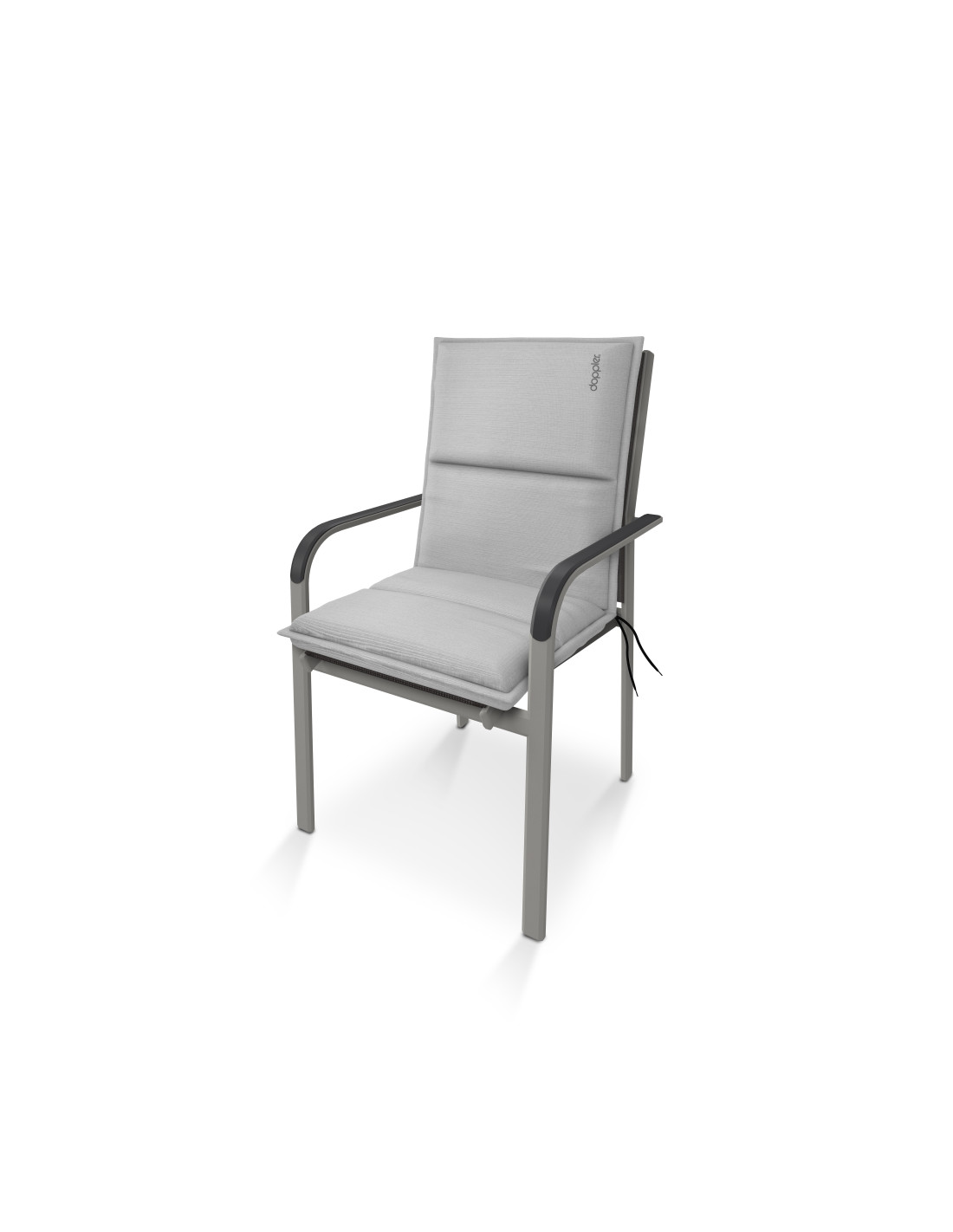 Polstr se střední opěrkou na zahradní nábytek řady CITY. Elegantní polstr v módním odstínu, zdobený výšivkou Doppler na opěradle. Polstr je v provedení s obšitým lemem, prošitý 1x v sedáku, 1x v opěradle. Uchycení je pomocí posuvné spony. Díky sponě si můžete nastavit velikost dle rozměru a druhu židle, spona je pevná a nevytahuje se. Upevnění sedáku je pomocí dvou tkaniček v ohybu polstru. Síla polstru je optimální pro všechny druhy židlí. Provedení je vhodné i do náročných podmínek kaváren, zahrádek a restaurací. Potah je nesnímatelný.