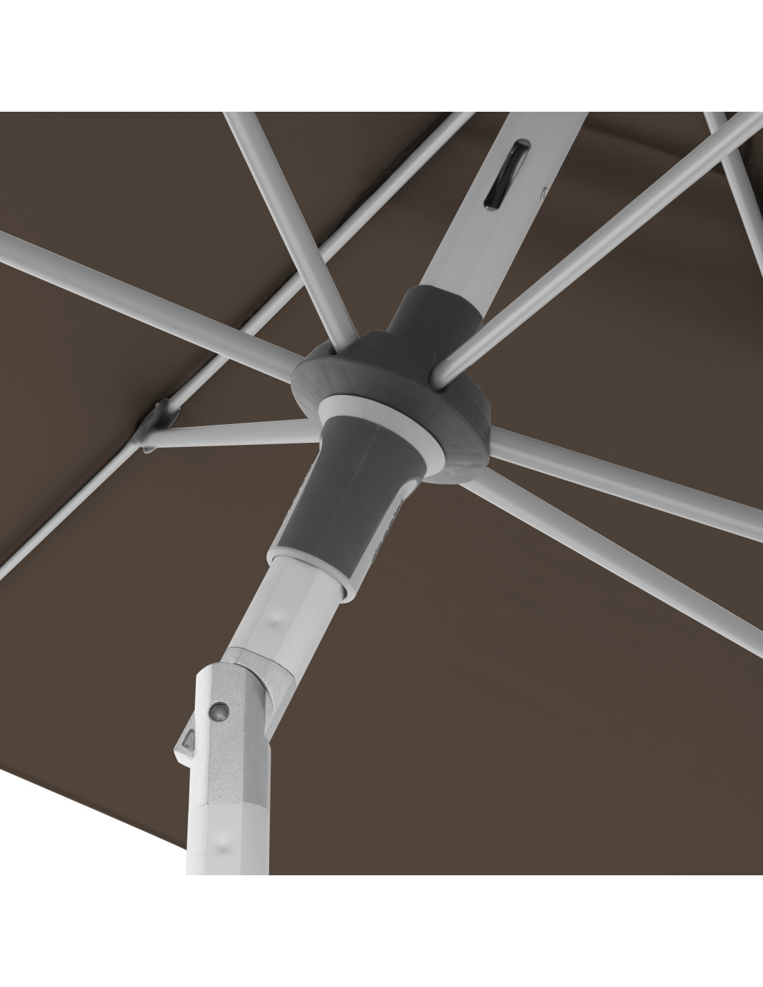 Slunečník s kličkou má kvalitní hliníkovou konstrukci a funkci automatického naklápěcího kloubu. Lze výškově nastavit. Potah je vyroben z 100% polyesterové tkaniny odolné povětrnostním vlivům s dobrou UV ochranou 80+.
