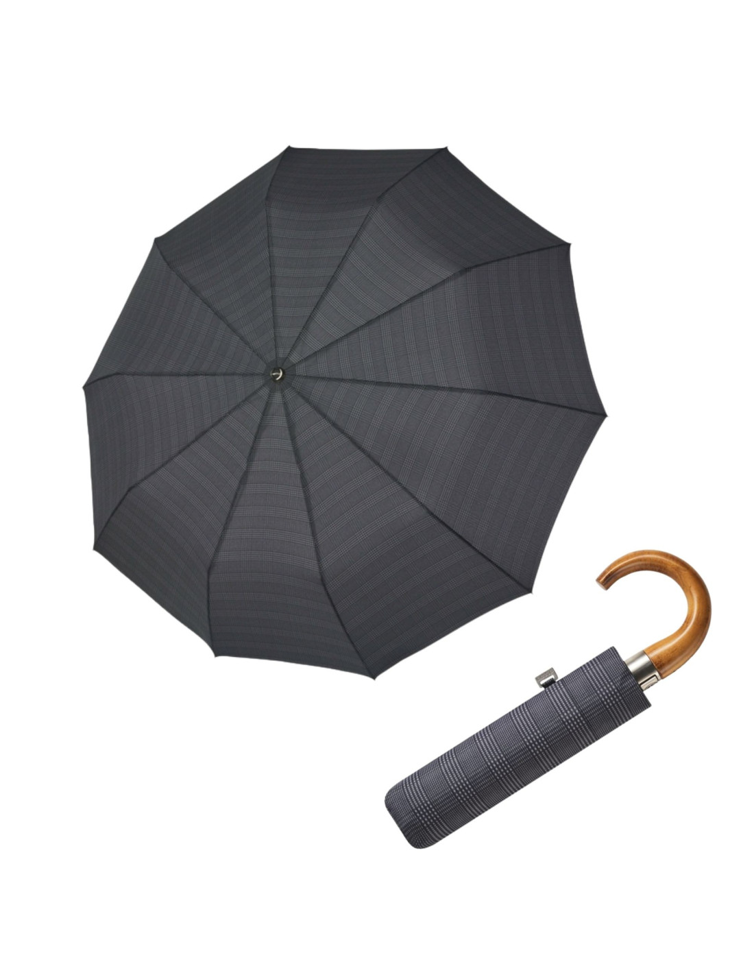 Pánský plně automatický deštník v moderním provedení se zahnutou dřevěnou rukojetí. Kostra deštníku je vyrobena v kombinaci materiálů sklolaminát a ocel zaručuje pevnost a stabilitu. Při otočení deštníku nedojde k jeho poškození. Odolný proti korozi. Polyesterový potah je odolný proti změnám vlhkosti a teplot, nesráží se.