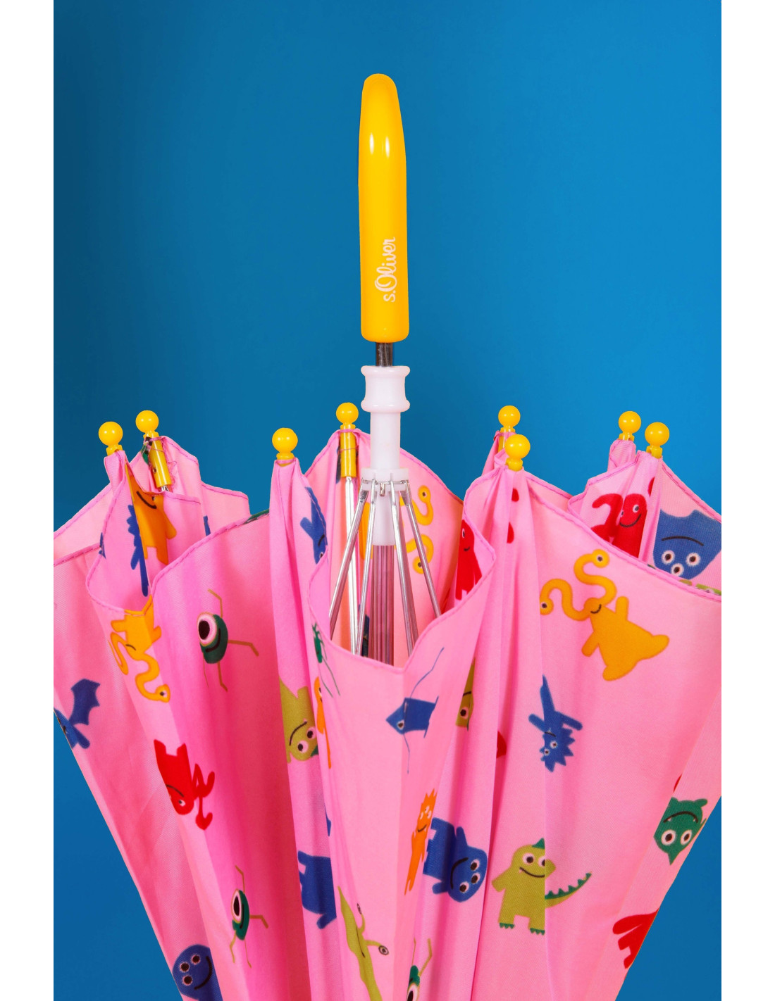 Dětský skládací deštník od trendy značky s.Oliver. S motivem monster růžový se žlutou rukojetí. Konstrukce ze ocele. Polyesterový potah je odolný proti změnám vlhkosti a teplot, nesráží se. Ochranné plastové koncovky.