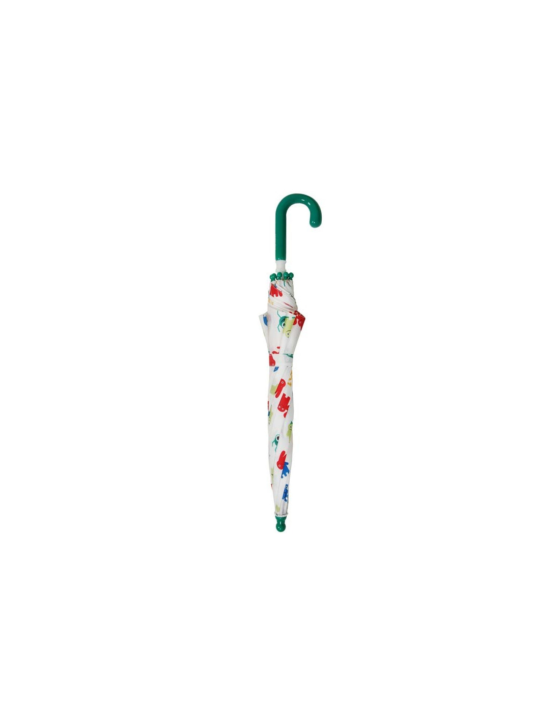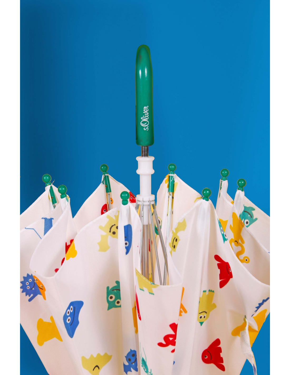Dětský skládací deštník od trendy značky s.Oliver. S motivem monster bílý se zelenou rukojetí. Konstrukce ze ocele. Polyesterový potah je odolný proti změnám vlhkosti a teplot, nesráží se. Ochranné plastové koncovky.