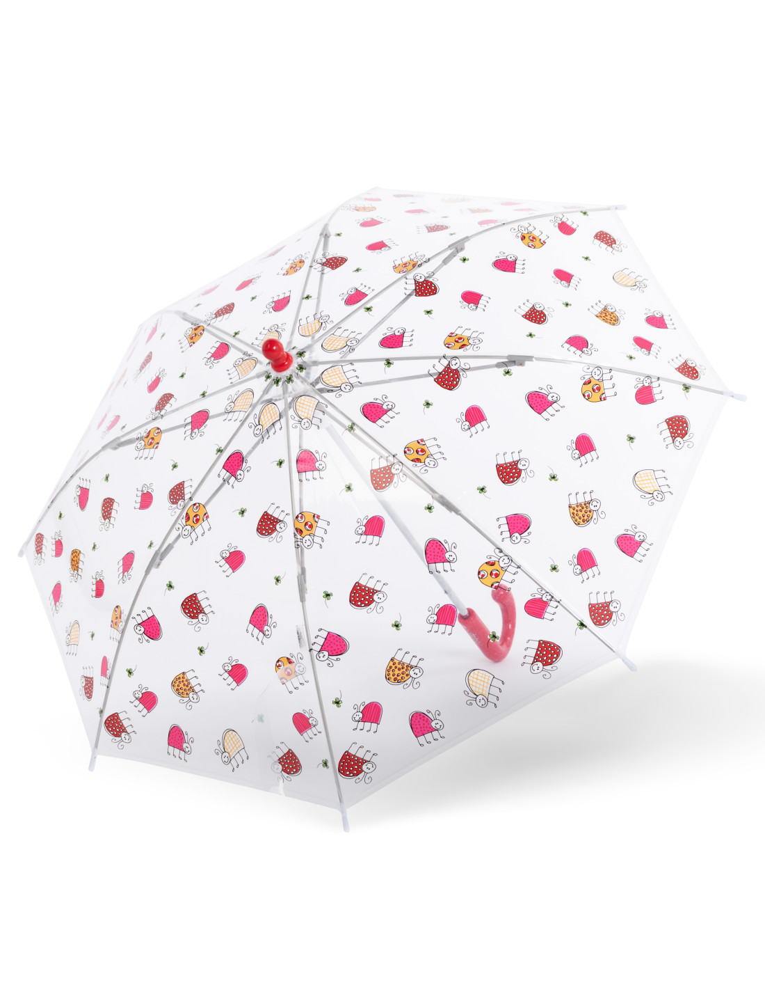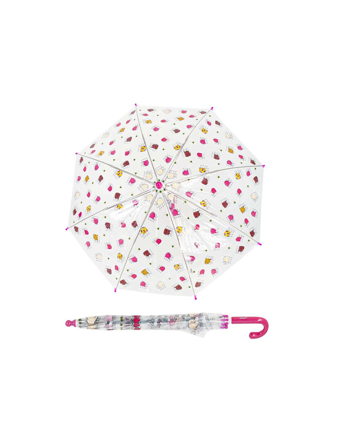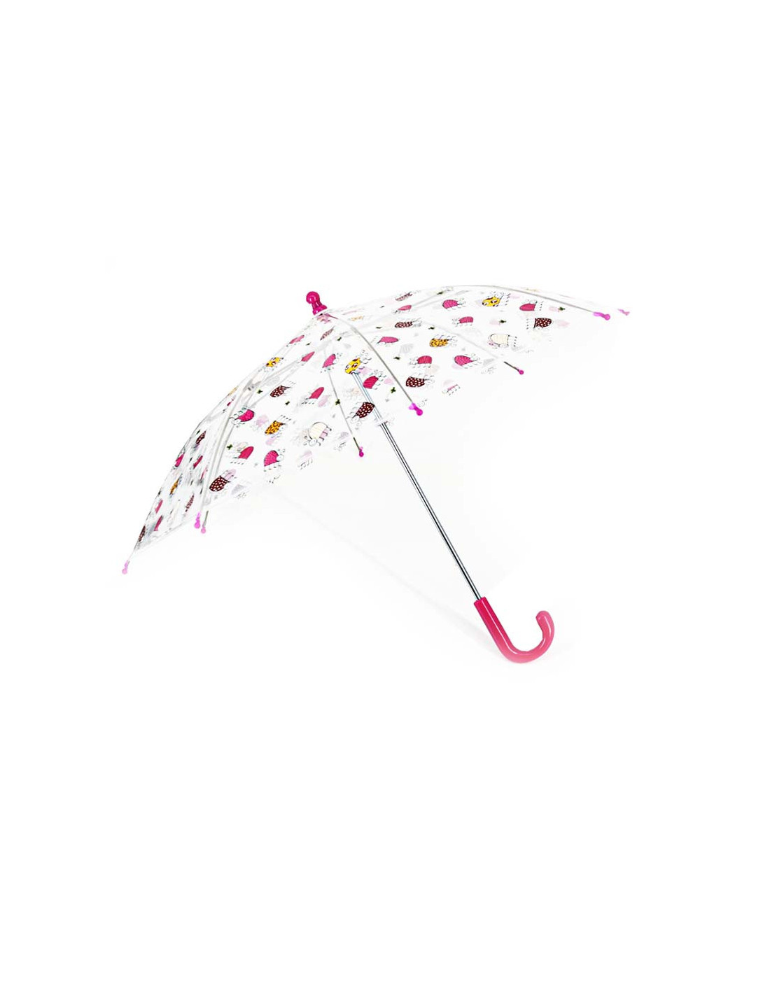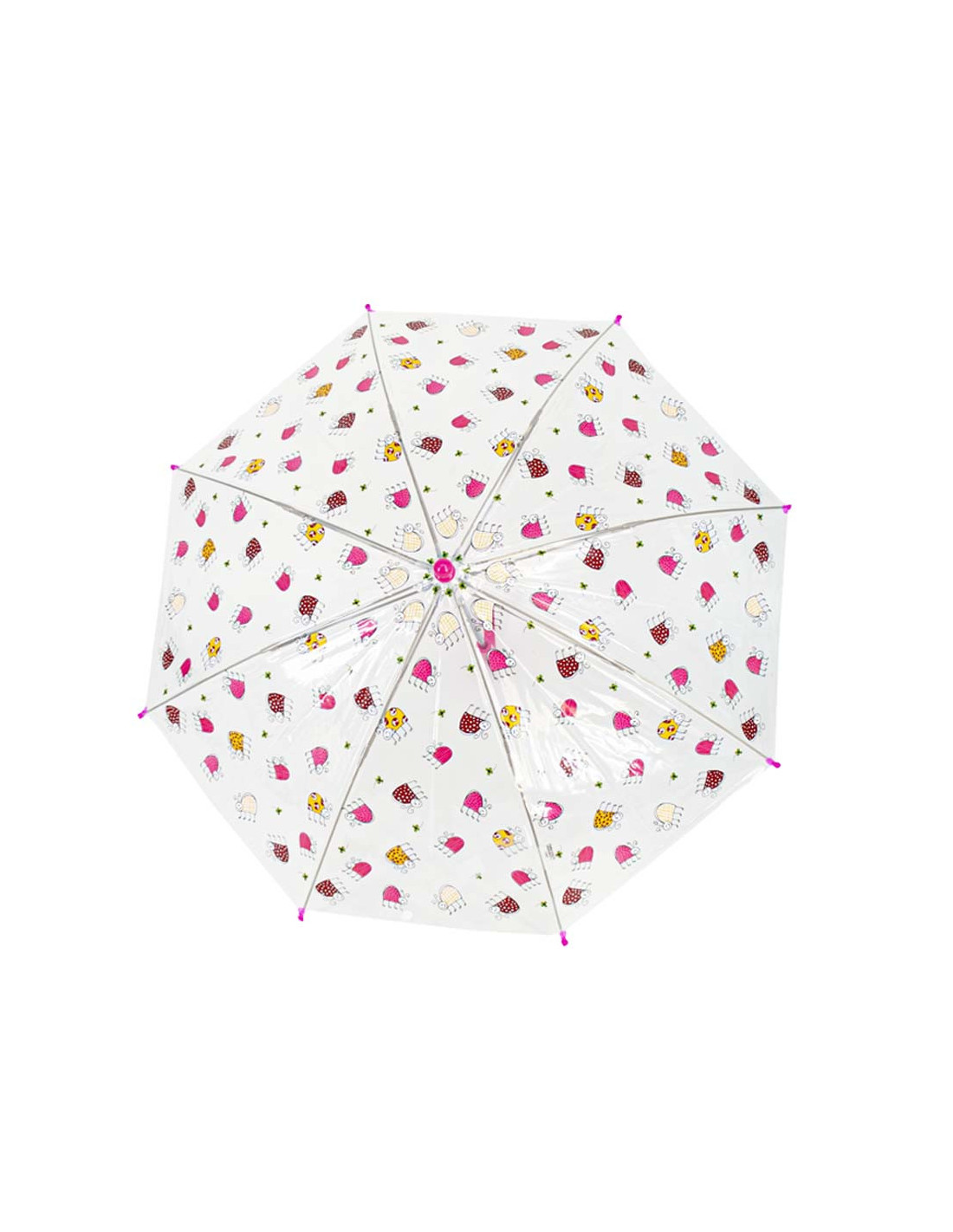 Dětský holový deštník s průhlednou střechou s veselými obrázky, které dětem rozzáří i deštivé dny. Velice kvalitní konstrukce ze sklolaminátu, barevná plastová ručka.