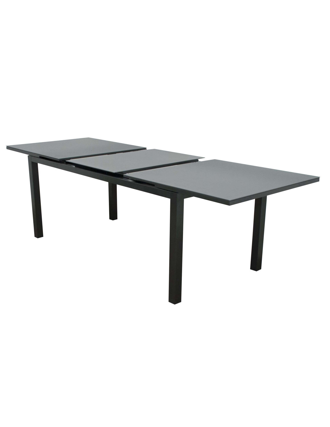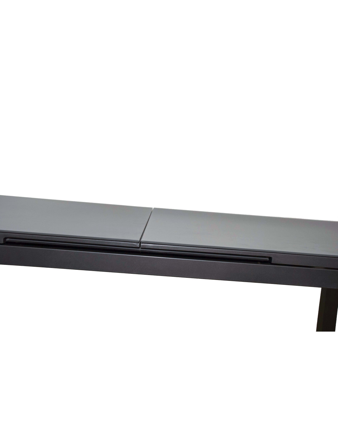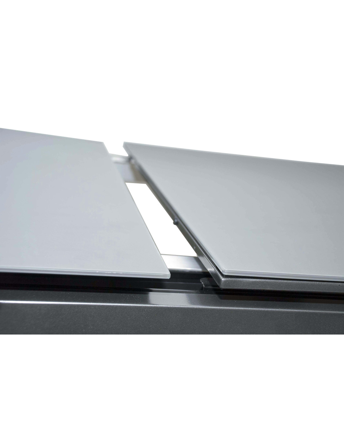 Zahradní rozkládací stůl FIRENZE je moderní venkovní nábytek minimalistického funkčního designu. Jedná se o spojení skla a kovu v elegantní celek. Stůl je stabilní a odolný. Má hliníkovou konstrukci v antracitové barvě. Deska stolu je z velmi odolného bezpečnostního tvrzeného skla v tmavě šedé barvě. Tloušťka skla je ca 5 mm. Díky strukturování nejsou na skle vidět stopy po poškrábání či otisky prstů.