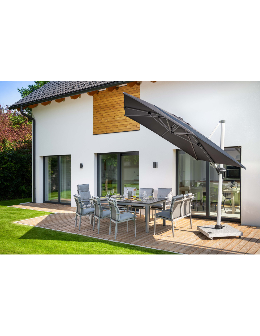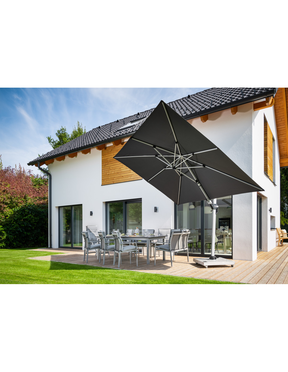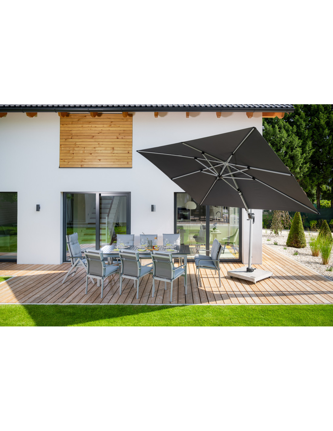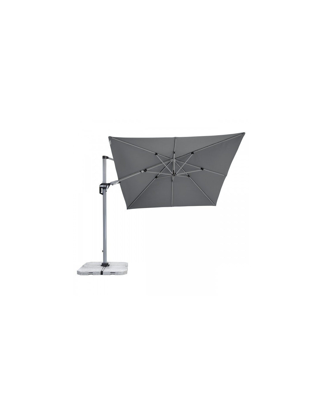 Active 350 x 260 cm je velice všestranný a vysoce kvalitní slunečník s pevným hliníkovým rámem. Obdélníkový tvar střechy je obzvláště vhodný pro zastínění zahradního nábytku. Kromě toho se slunečník dá přizpůsobit pohybu slunce během dne, protože je možné jej otočit o 360°, natočit axiálně na obě strany a může být nastaven pod úhlem dozadu, čímž se optimálně přizpůsobuje pohybu slunce. Potah je vyroben z polyesterové tkaniny odpuzující vodu s dobrou UV ochranou 50+.