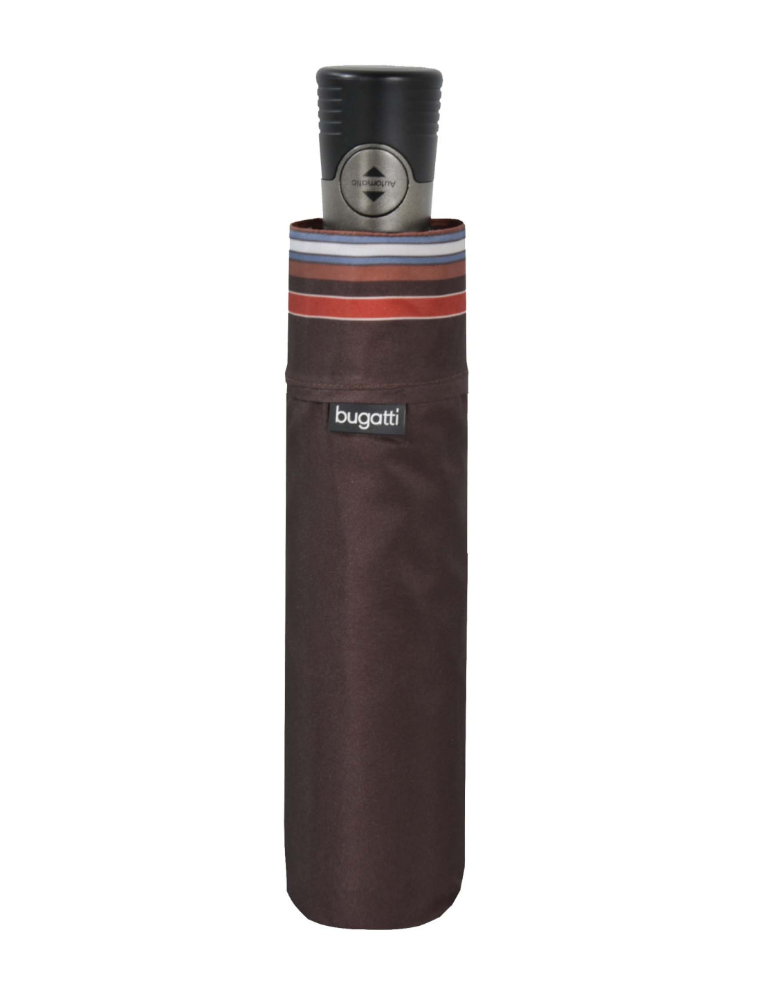 Elegantní pánský plně automatický skládací deštník Take it duo od trendy značky Bugatti zaujme svou velikostí - s pouhými 28 cm délky si jej snadno přibalíte s sebou na cesty. Konstrukce kombinuje výhody ocele, sklolaminátu a hliníku. Díky tomu, že je poslední díl ramene ze sklolaminátu, deštník dobře pruží ve větru a ani pokud dojde k jeho převrácení, nepoškodí se. Polyesterový potah je odolný proti změnám vlhkosti a teplot, nesráží se. Plně automatické ovládání umožňuje deštník snadno otevřít i zavřít stisknutím tlačítka.