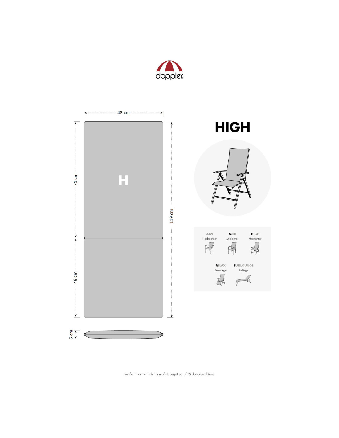 Polstr s vysokou opěrkou řady LIVING je v provedení s obšitým lemem, prošitý kroužkově 4x v opěradle. Uchycení je pomocí posuvné spony. Díky sponě si můžete nastavit velikost dle rozměru a druhu židle, spona je pevná a nevytahuje se. Upevnění sedáku je pomocí dvou tkaniček v ohybu polstru. Síla polstru je optimální pro všechny druhy židlí. Provedení je vhodné i do náročných podmínek kaváren, zahrádek a restaurací. Potah je nesnímatelný.