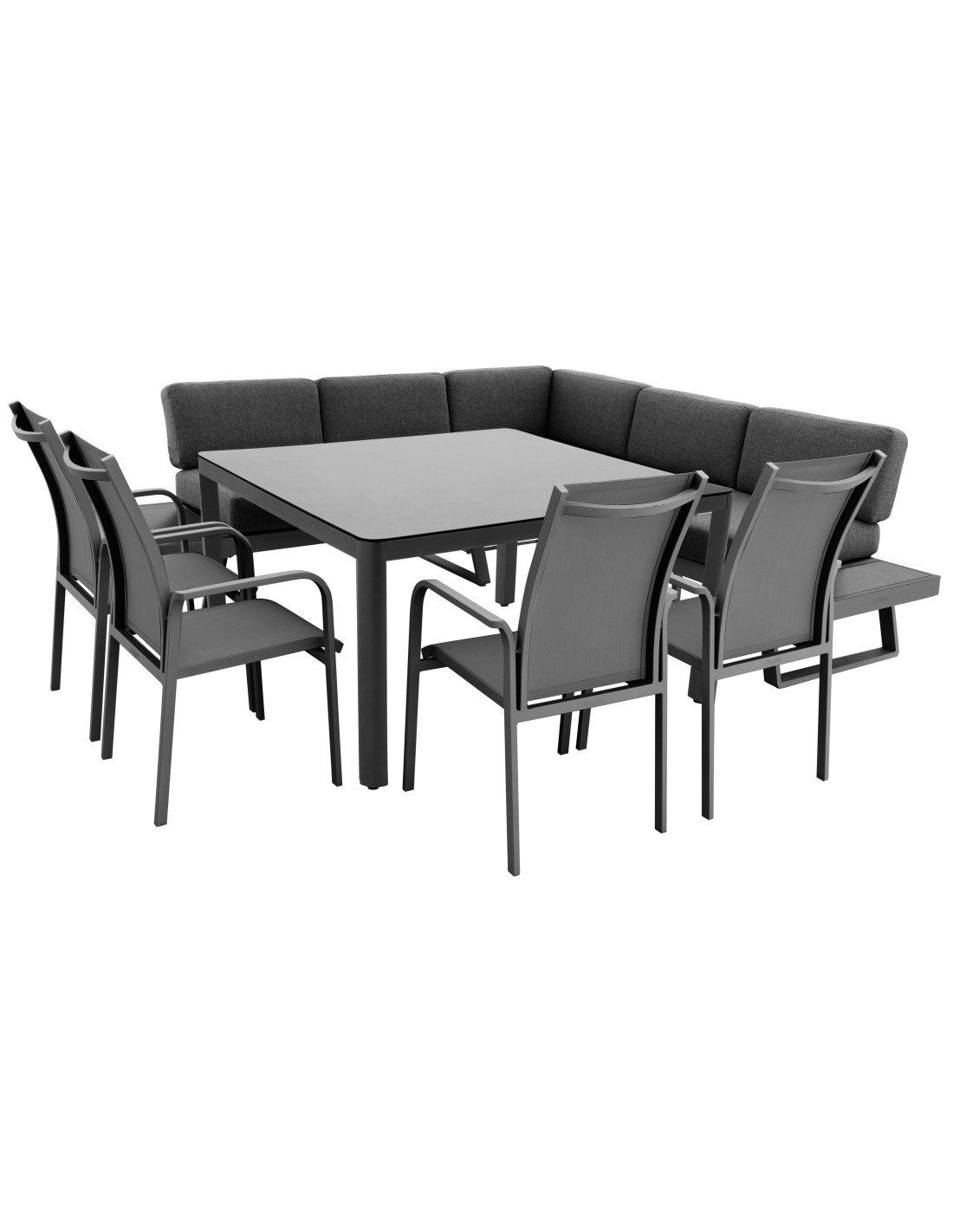 Naše sedmidílná jídelní souprava Expert Plus Aversa Keramik se pyšní hliníkovou konstrukcí, která je odolná a lehká, což ji činí ideální pro venkovní použití. Sestava obsahuje rohovou pohovku, skládající se z 2-místné a 3-místné části, přičemž 3-místná pohovka nabízí možnost polohování v 5 různých pozicích, což ji promění na pohodlné lehátko. Elegantní odkládací plochy, vyrobené ze sklokeramiky, dodávají soupravě šarm a praktickou funkčnost.