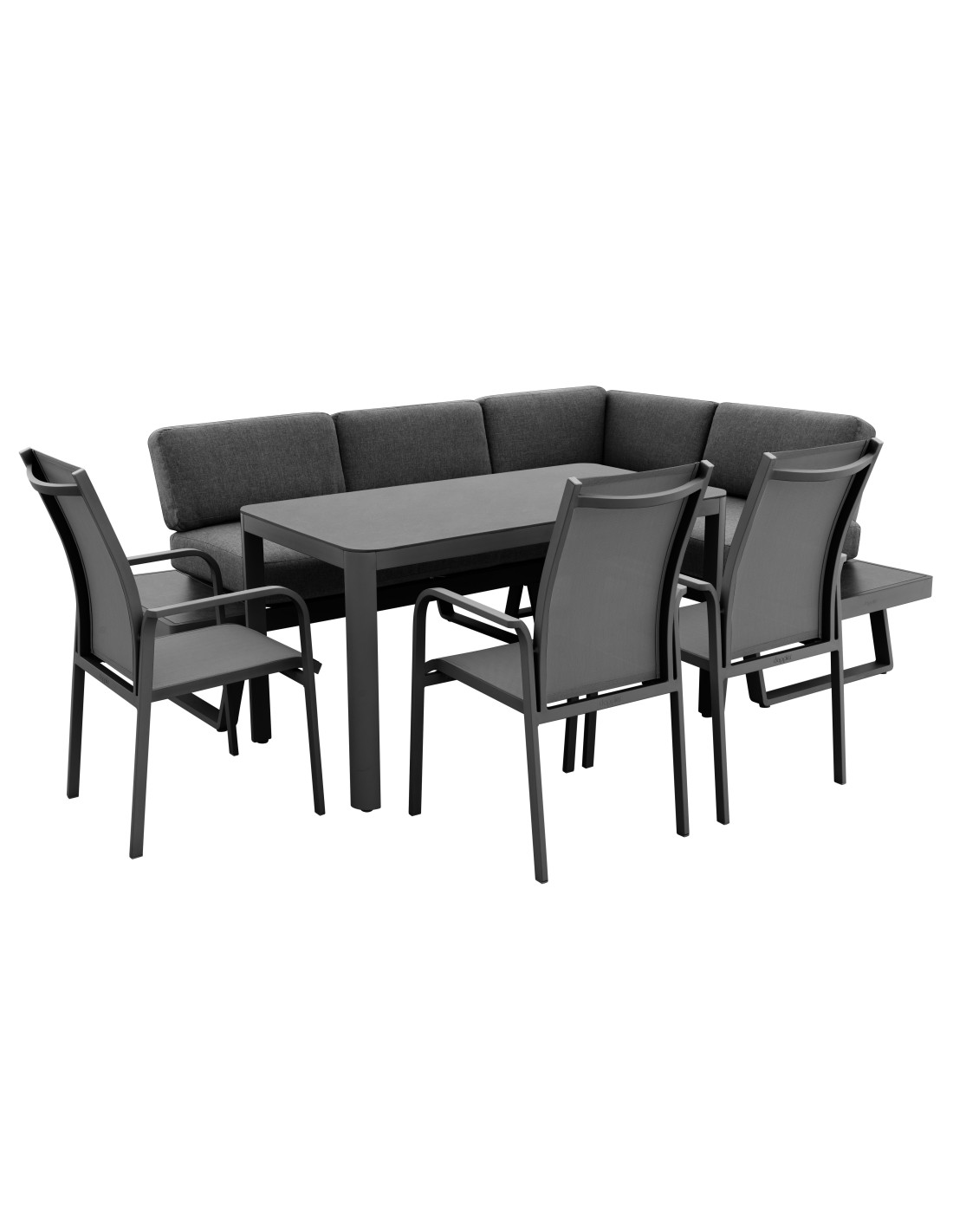 Naše šestidílná jídelní souprava Expert Plus Aversa Keramik se pyšní hliníkovou konstrukcí, která je odolná a lehká, což ji činí ideální pro venkovní použití. Sestava obsahuje rohovou pohovku, skládající se ze dvou 2-místných pohovek, stůl a tři židle. Elegantní odkládací plochy, vyrobené ze sklokeramiky, dodávají soupravě šarm a praktickou funkčnost.