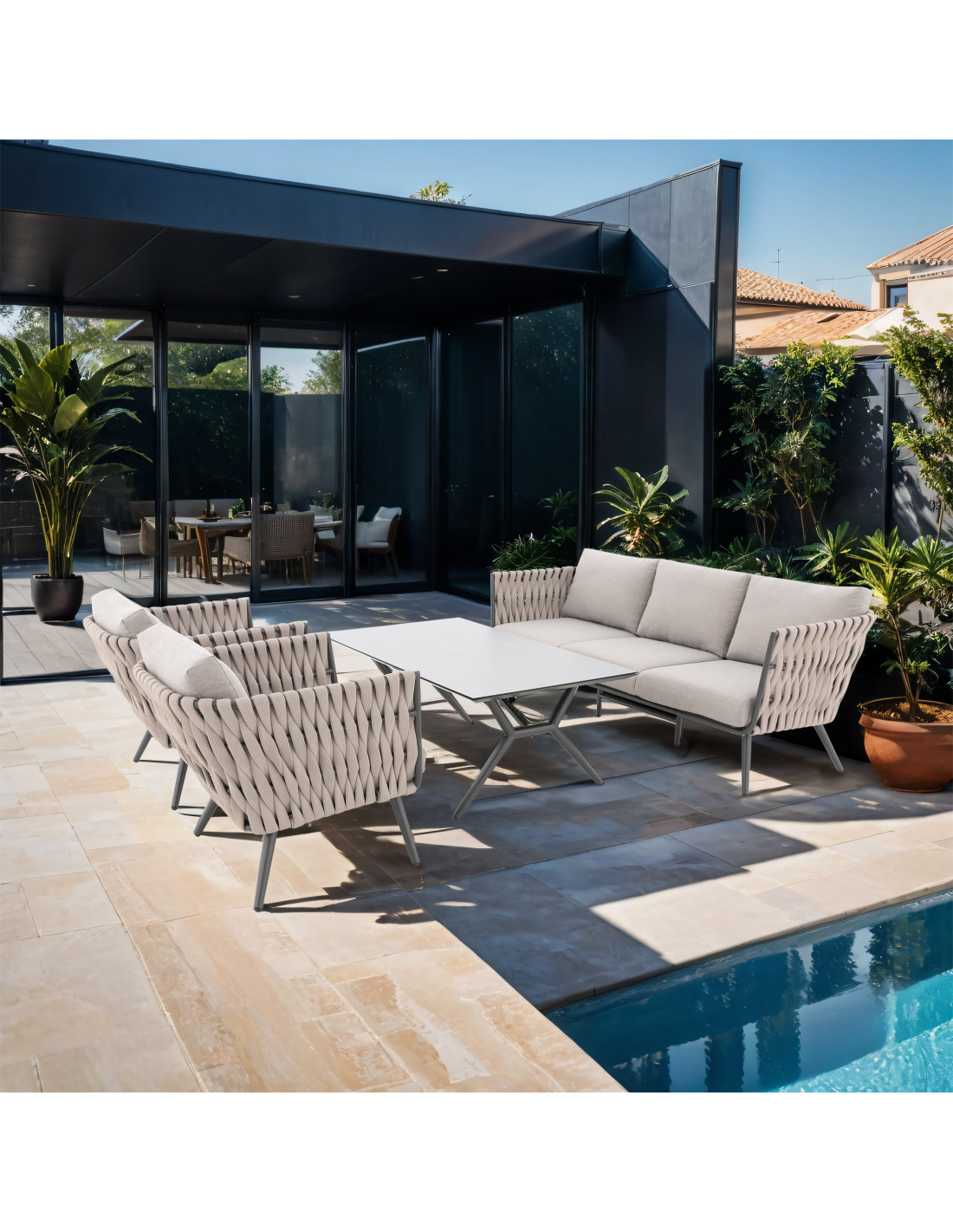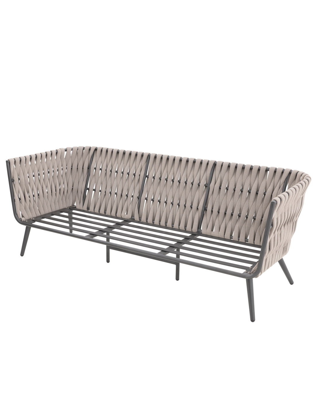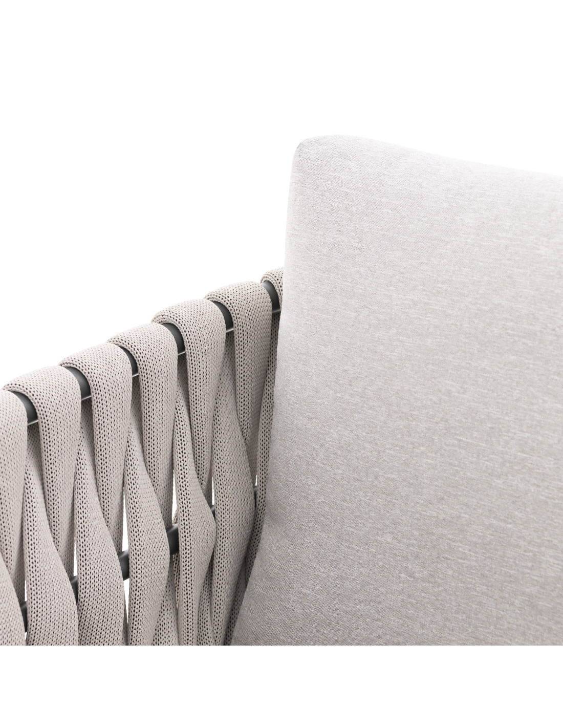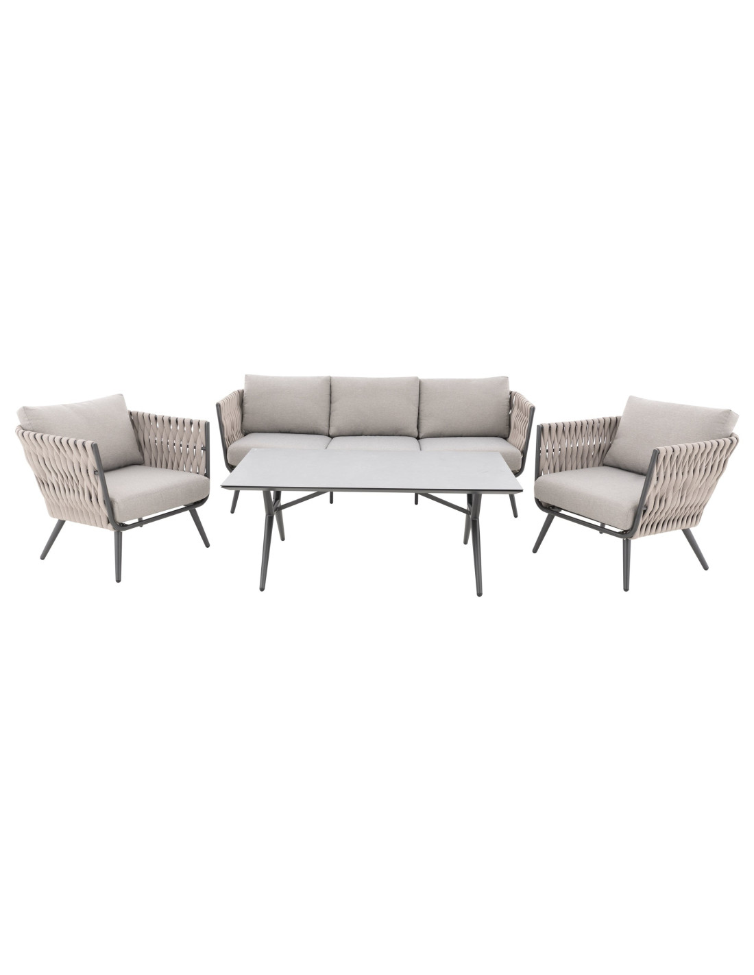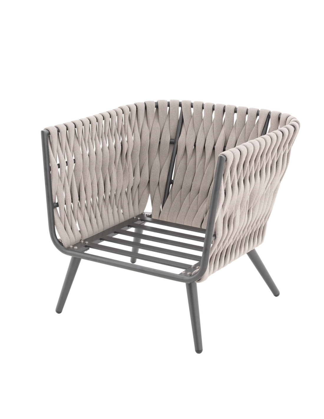 Pevná hliníková konstrukce s moderním práškovým nástřikem v antracitové barvě dodává sestavě nejen robustnost, ale i nadčasový vzhled, který se hodí do každého exteriéru i interiéru. Provazový výplet na opěrkách a područkách zajišťuje atraktivní design a pohodlí, které oceníte při každém posezení.