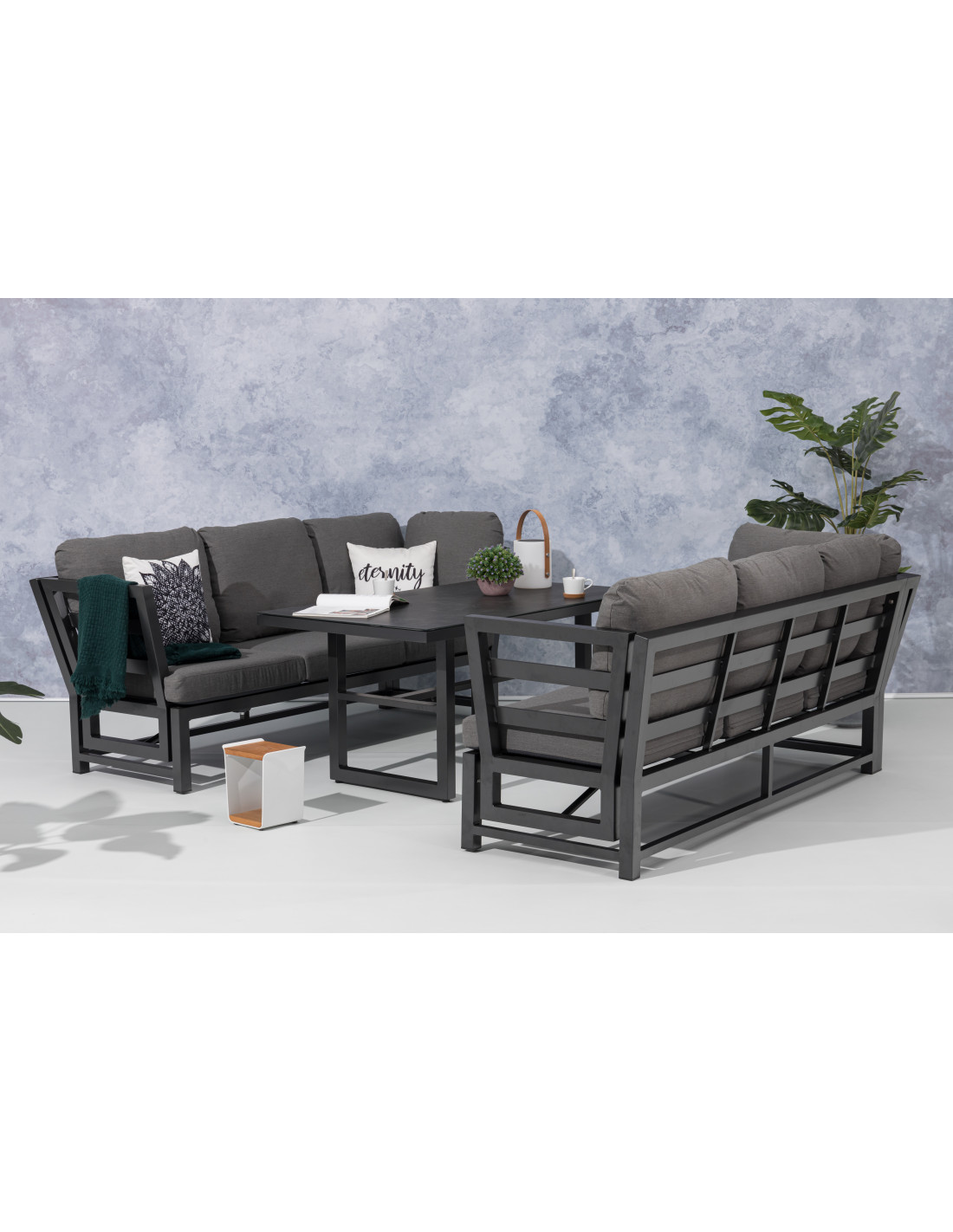 Konstrukce je vyrobena z lehkého odolného a bezúdržbového hliníku. Sestava obsahuje 2 x 3místnou pohovku a stůl. Součástí jsou šedé nadýchané polstry, potahy jsou snímatelné (lze je prát) a jsou z vyrobené z vysoce odolné textilie LIKA-TEX®.