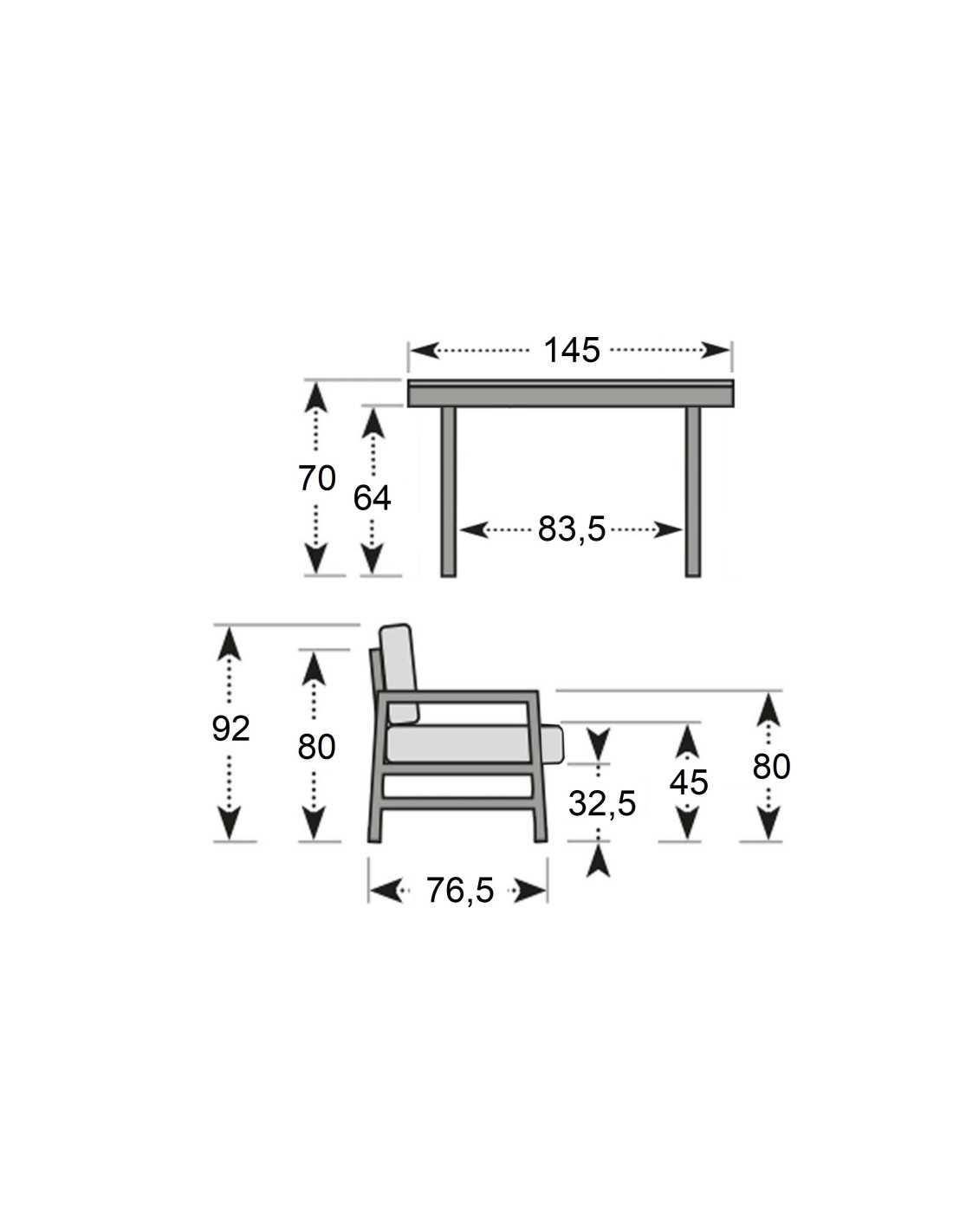 Konstrukce je vyrobena z lehkého odolného a bezúdržbového hliníku. Sestava obsahuje 2 x 3místnou pohovku a stůl. Součástí jsou šedé nadýchané polstry, potahy jsou snímatelné (lze je prát) a jsou vyrobené z vysoce kvalitní textilie LIKA-TEX®.