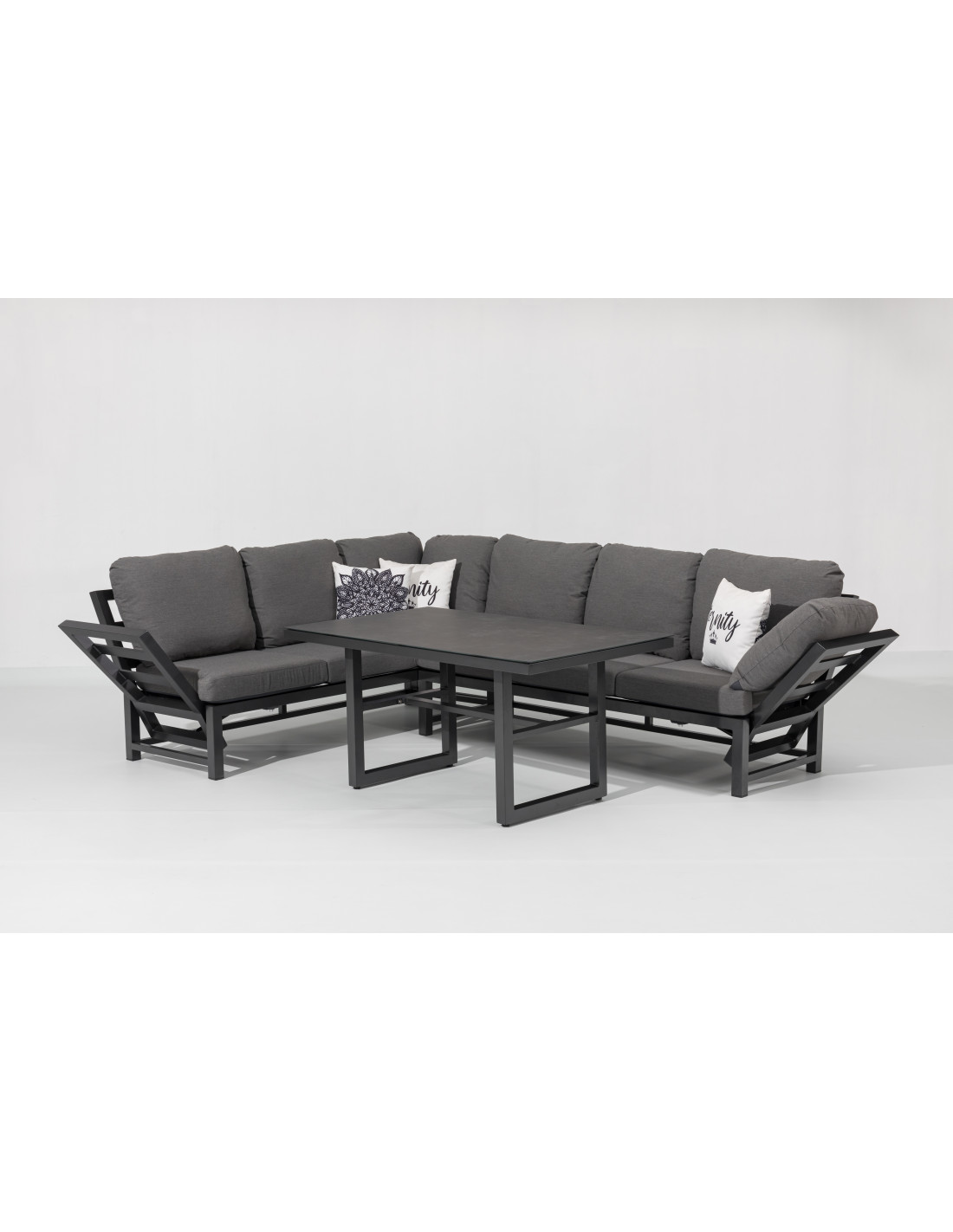 Luxusní zahradní sestava, která může být celoročně venku. Je velmi variabilní, lze obrátit strany a nebo pohovku rozdělit. Pro Vaše maximální pohodlí má polohovací boční opěrky.