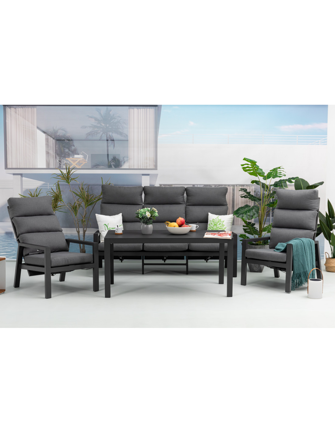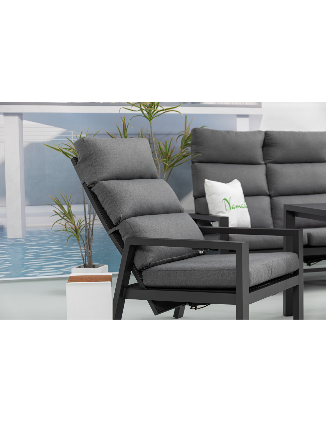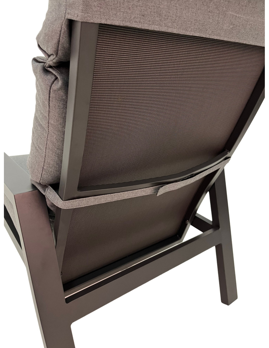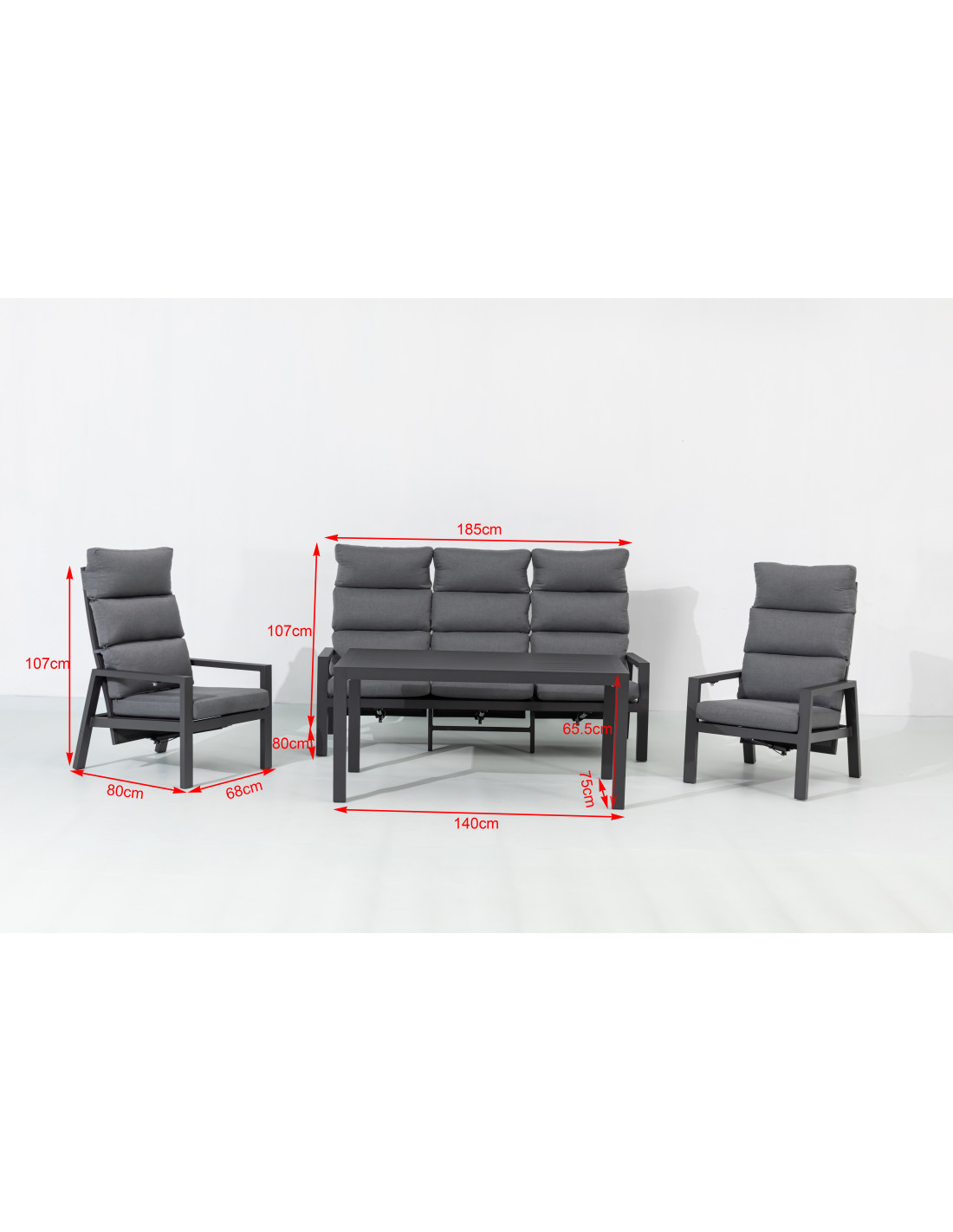 Zahradní sestava SANTINI je multifunkčním řešení pro každého, kdo rád relaxuje na zahradě či terase. Další výhodou je praktická výška stolu 66 cm. U stolu se tedy pohodlně i najíte. Obě křesla mají možností polohování opěrek zad pomocí pístu. Nadýchané polstry mají antracitové potahy ze 100% polyesteru, který je odolný, dobře odolává oděru či vlivům slunečního záření. Polstry jsou na zipy, potah je možné sejmout a vyprat. Samozřejmostí je bezúdržbová a stabilní hliníková konstrukce opatřená ochranným práškovým nástřikem v antracitové barvě, jejíž lehkost jistě oceníte vždy, když budete chtít sestavu přemístit.